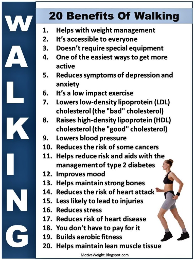 All in all, the simple act of walking (plus hill) became a real blessing to me. It’s something you too can start with if you’ve not actively exercised before. It helped me through good days, bad days, cheery and down days. Read the inestimable rewards of walking from the National Heart Foundation for yourself, and please also look closely at this summary chart: