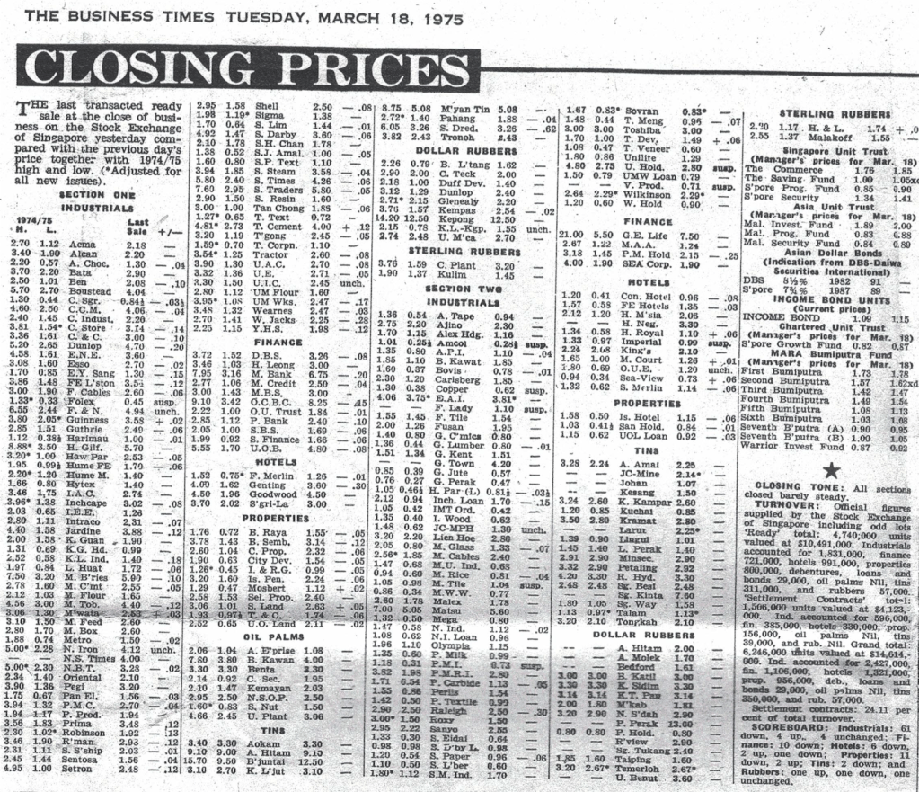 Closing share prices from Singapore’s Business Times, 1975 (my daily staple)