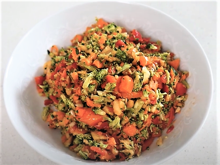 Deb beautifully blended broccoli, apple, carrots and red capsicum following Thermomix instructions. The salad was crunchy, fresh and easily digested. You’d never buy anything as good as this!