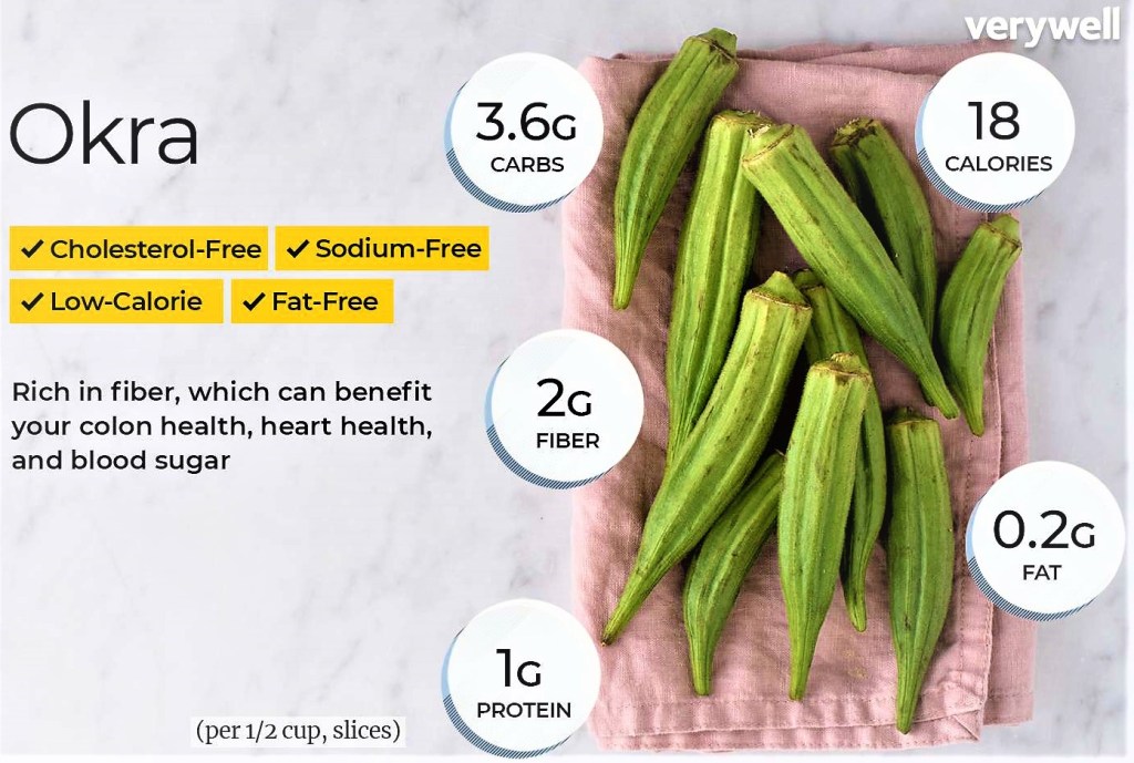 • Okra is high in antioxidants: rich in Vitamins A, C and K, a cupful of okra has 3.2g of fibre, 82mg of calcium and just 32 calories.